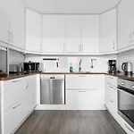 Ein Wasserkocher, ein Kühlschrank und ein Herd sind ebenfalls in der Küche der Villa Lovely 4 Bedroom House With The View Of Aurora vorhanden. Die Villa in Tromsø ist in unmittelbarer Nähe von der Bushaltestelle Solneset skole.
